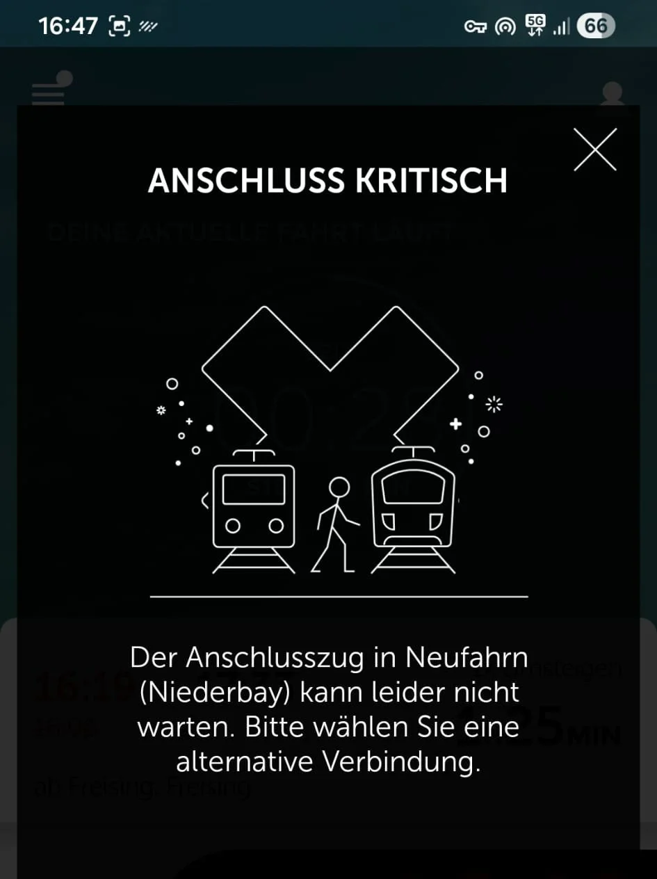„Warum wir zu spät sind, ist im Übrigen wieder völlig unklar. Auch der Zugführer wusste es nicht, nur ein ‚Außerplanmäßiger Halt auf freier Strecke‘.“ Er hat eine Zeitlang gehofft, dass der Anschluss in Neufahrn (Niederbay) vielleicht doch noch erreicht werden könnte. Aber das konnte er nicht, weshalb er auch diesen Screenshot schickt: