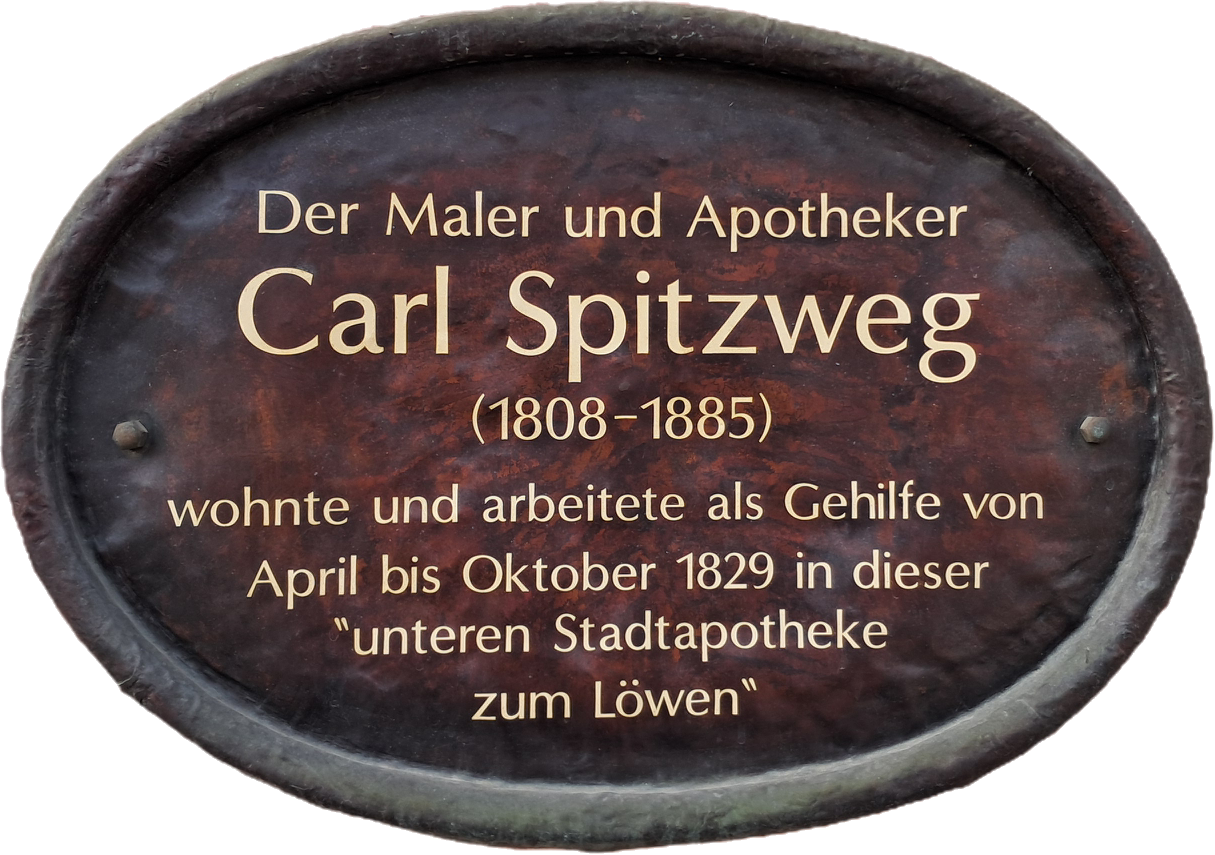 Und das Schild sollte so sein wie das Schild vom Carl Spitzweg. Der hat nämlich schon eines, an der früheren Löwenapotheke am Ludwigsplatz, obwohl er nur ein halbes Jahr da war, und zack, war er schon wieder weg. Ein halbes Jahr ist nicht lang.